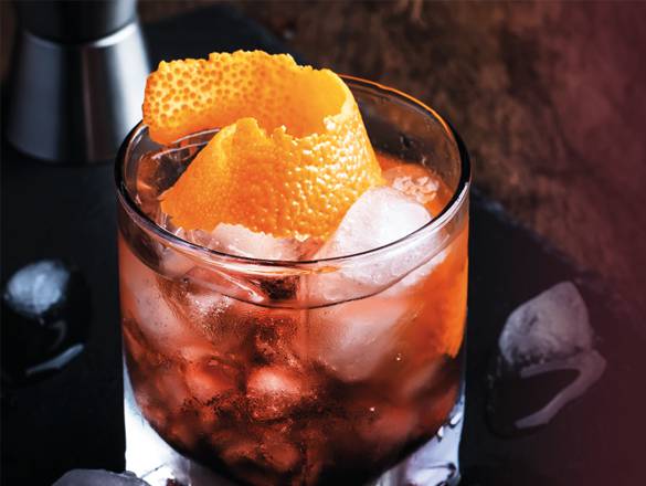 Den Tumbler mit ein paar Eiswürfeln (2 bis 3 Stück) füllen und dann die Spirituosen (4 cl neeka PREMIUM DRY GIN, 3 cl Campari und 3 cl roder Wermut) dazu geben. Alles ordentlich verrühren. Dann die Orangen- oder Zitronenschale darüber abspritzen und ebenfalls in den Drink geben.