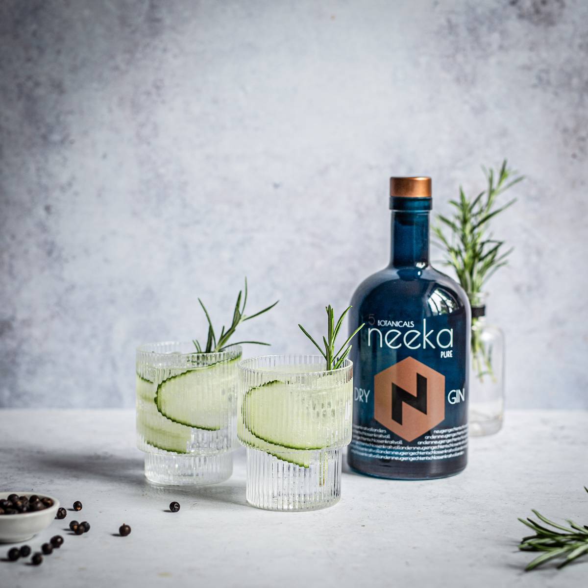 Gib 4-5 cl neekaPURE in ein Glas mit 3-4 Eiswürfeln und fülle es mit Tonic Water auf. Ein Rosmarinzweig und 2 Stück Gurke versprühen einen Hauch von Urlaub und verleihen dem Gin Tonic eine mediterrane Leichtigkeit. Unvergesslich in Kombination mit einem klassischen Tonic Water.